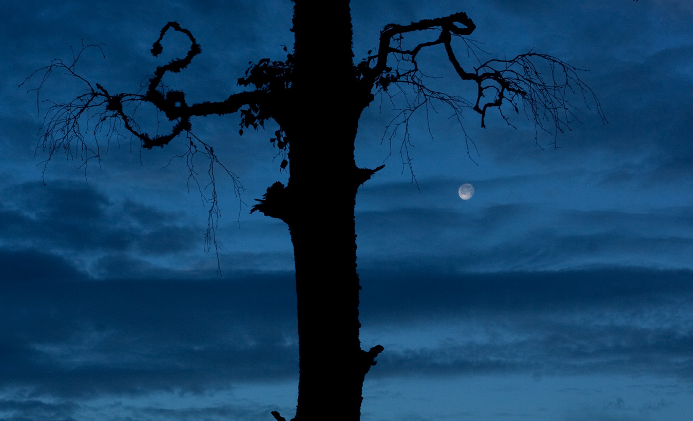 Day one. This tree stood in the blue twilight with the moon just visible through the clouds to the right. The bare, twisted branches spread out like arms - or something reaching. It was the kind of tree that looks unremarkable in daylight but transforms completely once the sky drops to that deep blue. I didn't compose this so much as recognize it when I saw it.