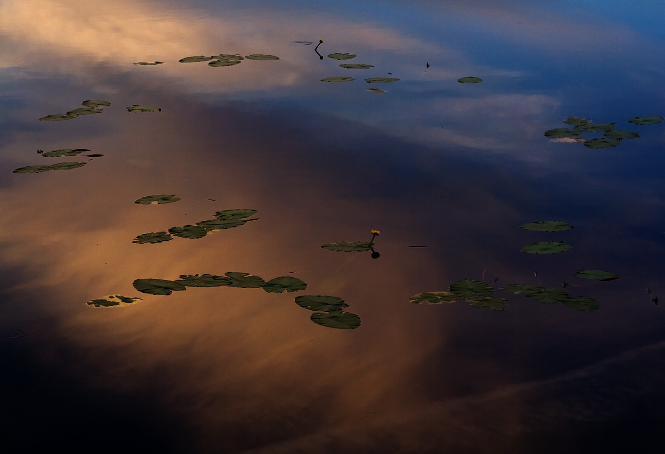 Day two. A small pond with water lilies, shot straight down at golden hour so the frame becomes entirely the water surface - the sky reflected below the lily pads, the actual sky absent. Two yellow flowers break the surface. The lilies float on orange and blue at the same time.