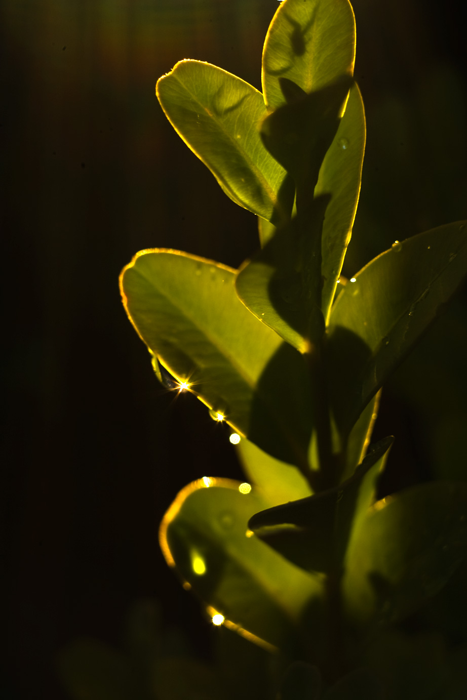 Day three. A boxwood in the garden, close up, shot into the early morning light. The dew drops along the leaf edges catch the sun and turn into small points of light, almost like sparks. The leaves themselves glow yellow-green where the light passes through them. You don't need to go anywhere for this - you just need to be outside early enough.