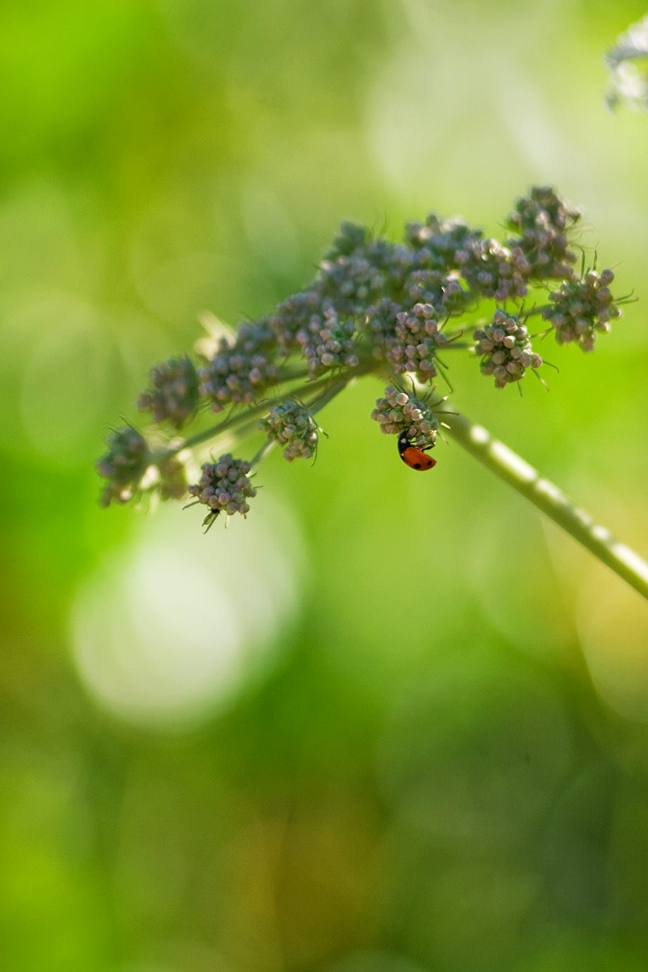 Day five. A ladybug on what I think is wild carrot - the tiny flower clusters still closed. The subject is small in the frame. The background dissolves into soft green. There's something about the scale of this image that I like: the ladybug is doing something completely its own, indifferent to being photographed.