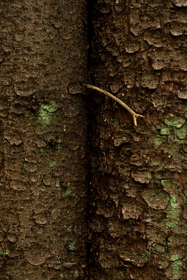 Day seven. Two trunks standing close, bark covered in lichen. A single small branch reaches from one to the other in the gap between them - the only thing in the frame that isn't vertical. I found this in the forest on the last day, after a week of going out twice daily into the same landscape. By then I was looking at things differently. You start to notice the small gestures.