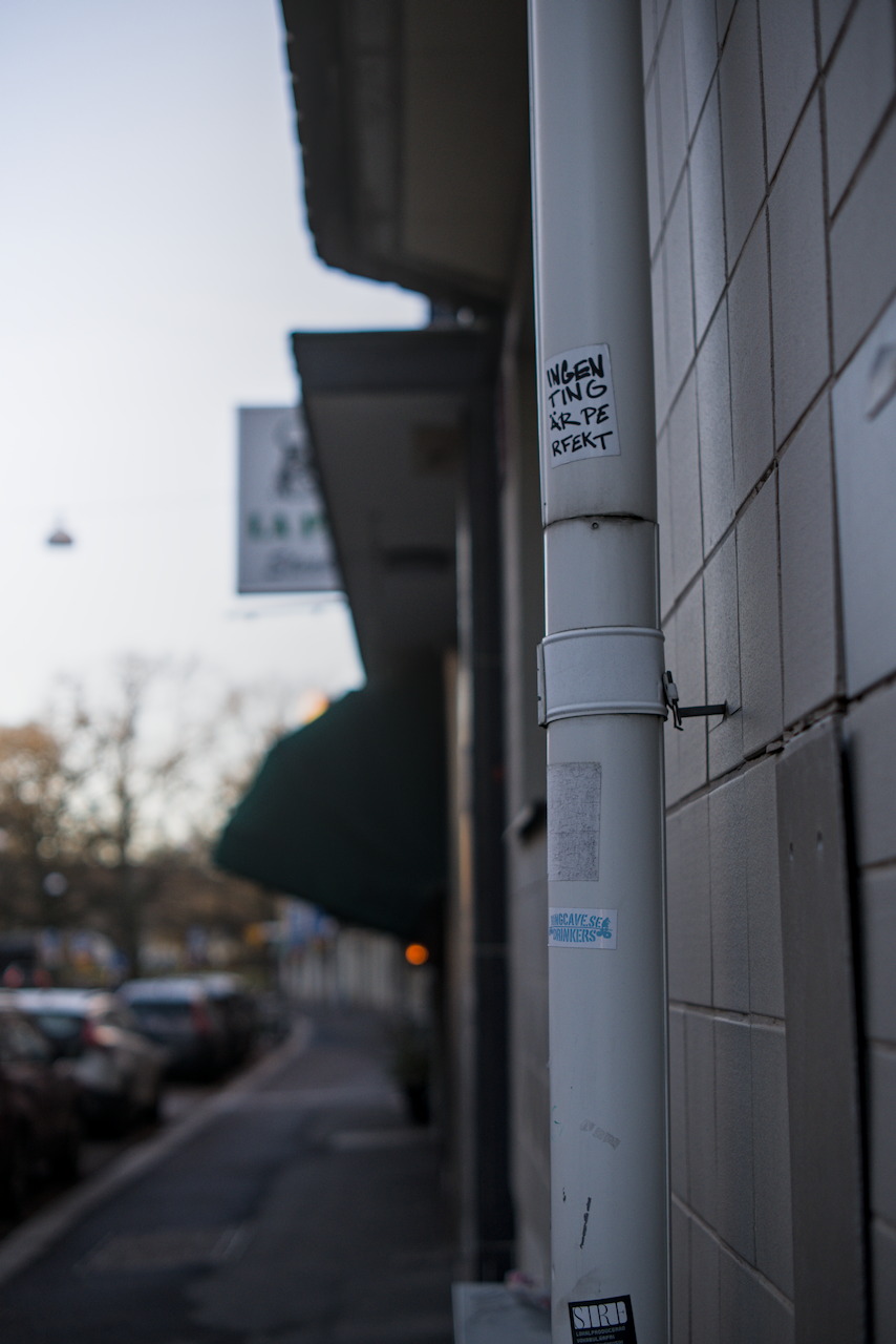 That sticker - "Ingenting är perfekt," Swedish for "Nothing is perfect" - seems almost too on the nose for a lens review. But I kept that shot because it captures something honest about using gear like this. The TTartisan is not perfect. The optics are soft wide open, flare is a real issue (or a bonus if you want flare), and the 39mm filter thread is a minor inconvenience. None of that stopped me from using it consistently for over two months.